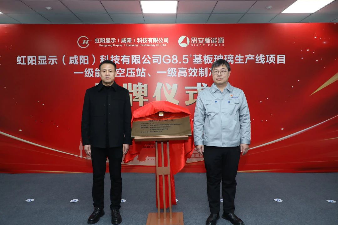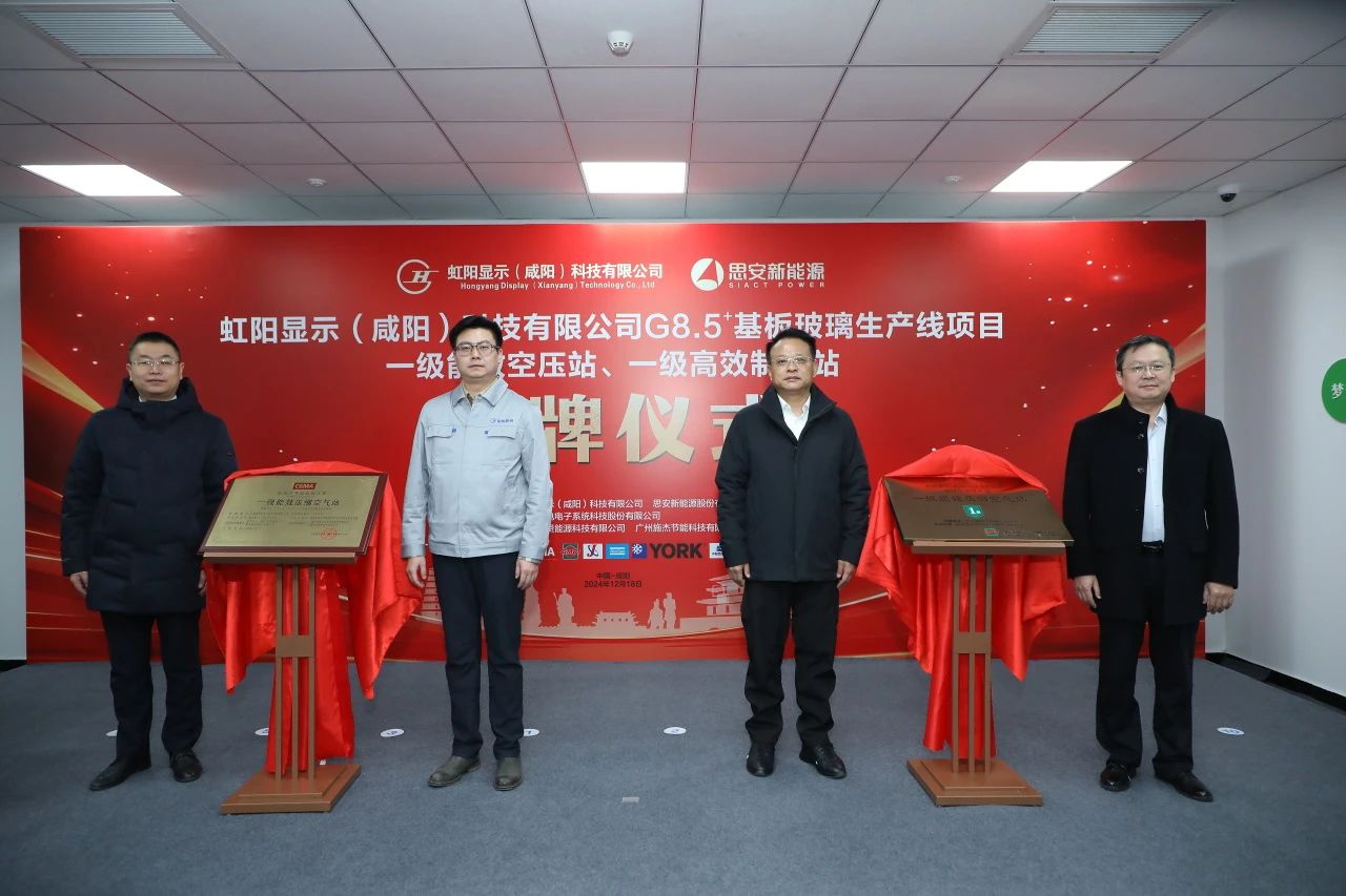 2024年12月18日,彩虹股份咸阳G8.5+基板玻璃生产线建设项目一级能效空压站、一级高效制冷站挂牌。